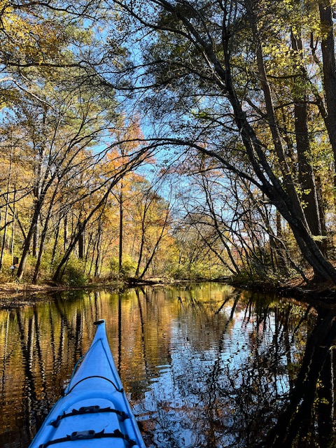 The wildness of Cow Bridge Branch is not by happenstance. It’s not that it’s just been lucky enough to escape the buzz saw of developers. The Doe Bridge Nature Preserve, designated in 1991, cradles most of the western side of the stream and both sides in some places. (You’ll know the land that’s not part of the preserve because of the hunting blinds and the “No Trespassing” signs.) The preserve protects fifteen rare, threatened, or endangered plant, animal, and insect species, (one of which, the Chermock’s mulberry wing butterfly, is found in only one other place in the world) as well as historical remnants of a colonial settlement. And since there is no public land access to the preserve, the only way to experience it is by water.